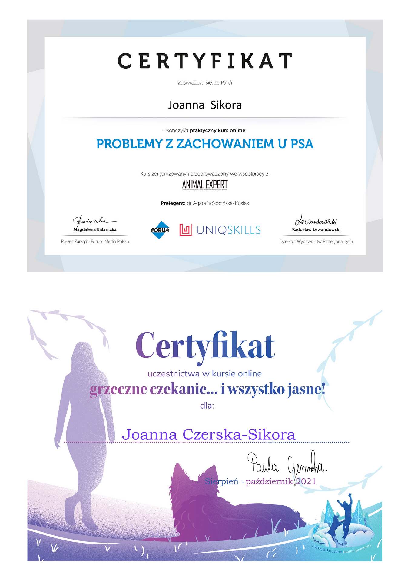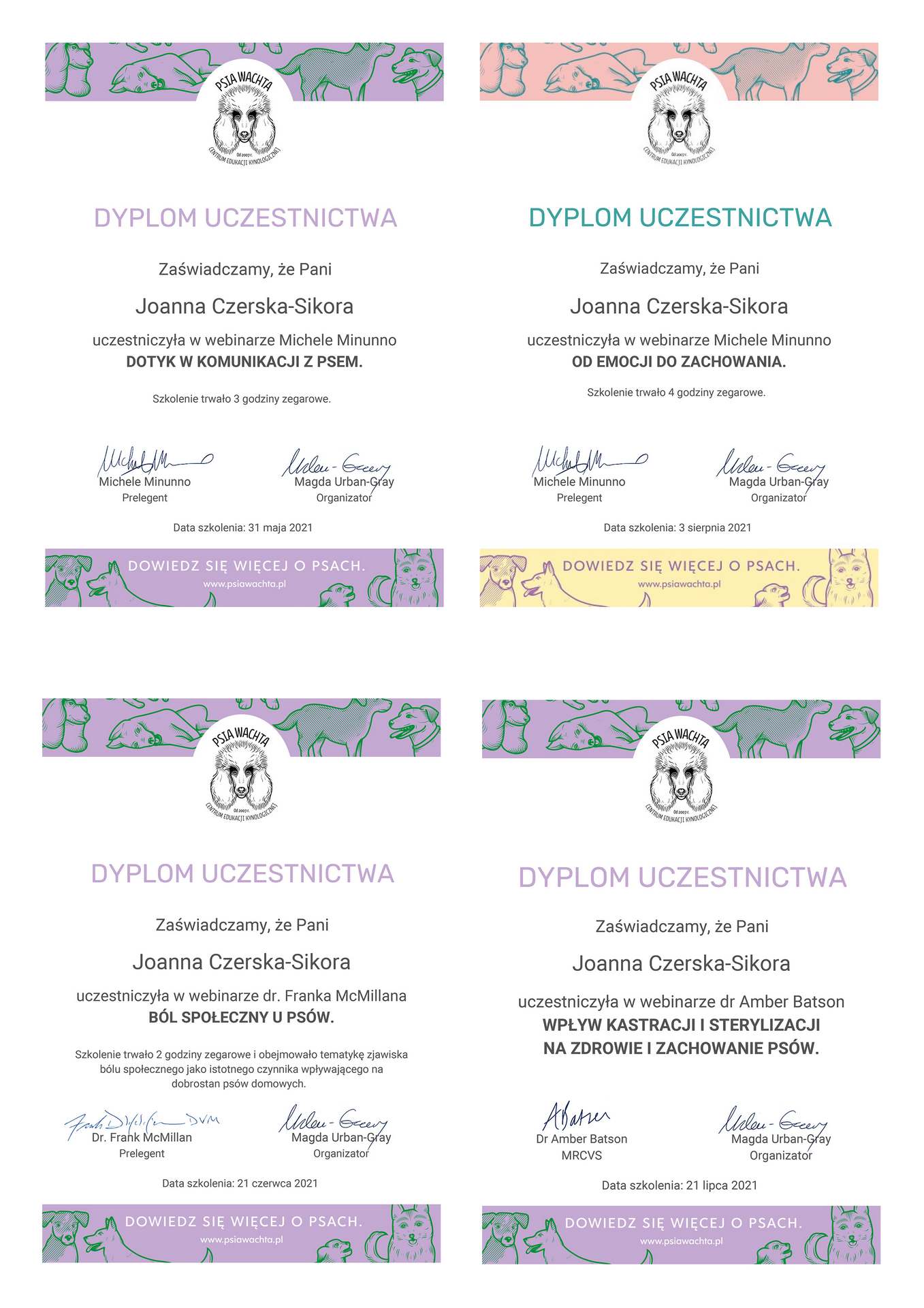 W 2021r. ukończyłam Kurs zawodowy Instruktor Szkolenia Psów/Treser Psów w Centrum Edukacji Kynologicznej Psia Wachta. Stale rozwijam się biorąc udział w szkoleniach prowadzonych przez Specjalistów z Polski a także zza granicy, aby móc Wam pomagać ( poniżej kilka z nich).