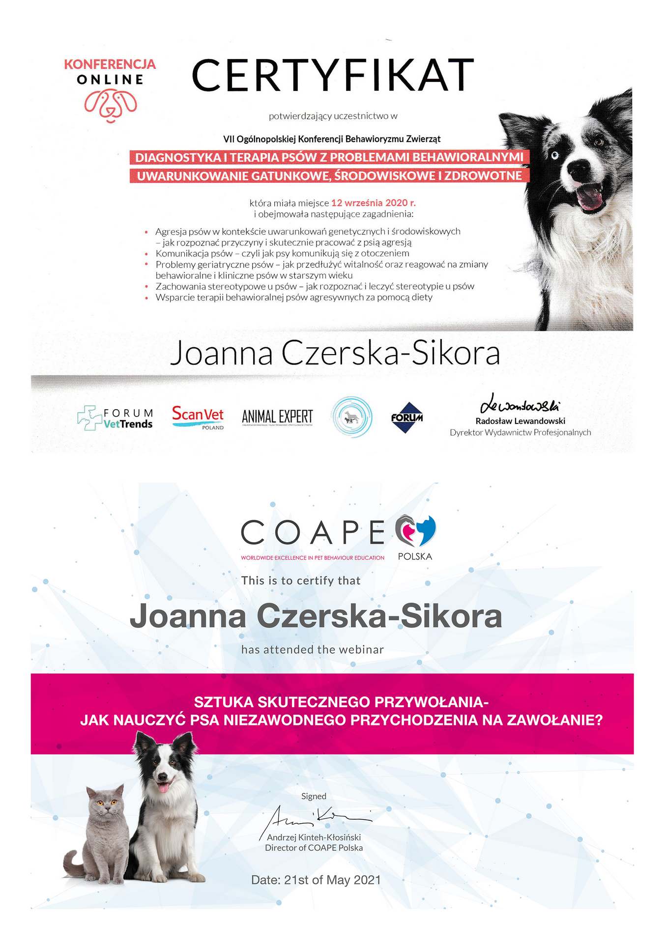 • Kurs Podstawy Pozytywnego Szkolenia Psów, Centrum Edukacji Kynologicznej Psia Wachta, sierpień 2020r.